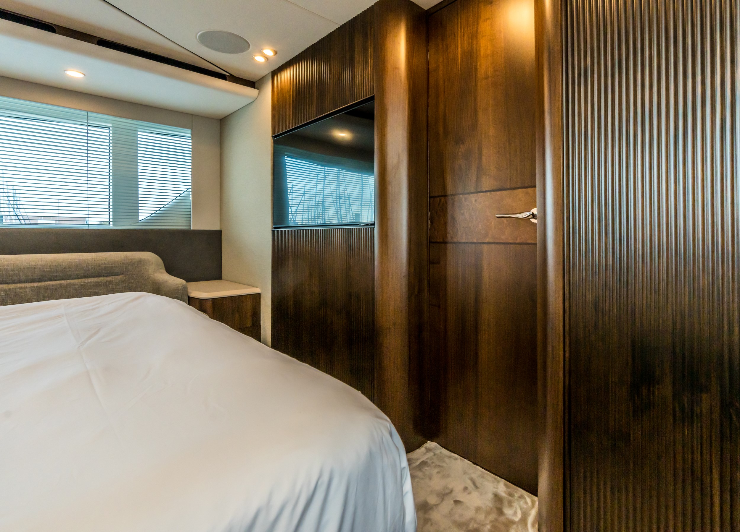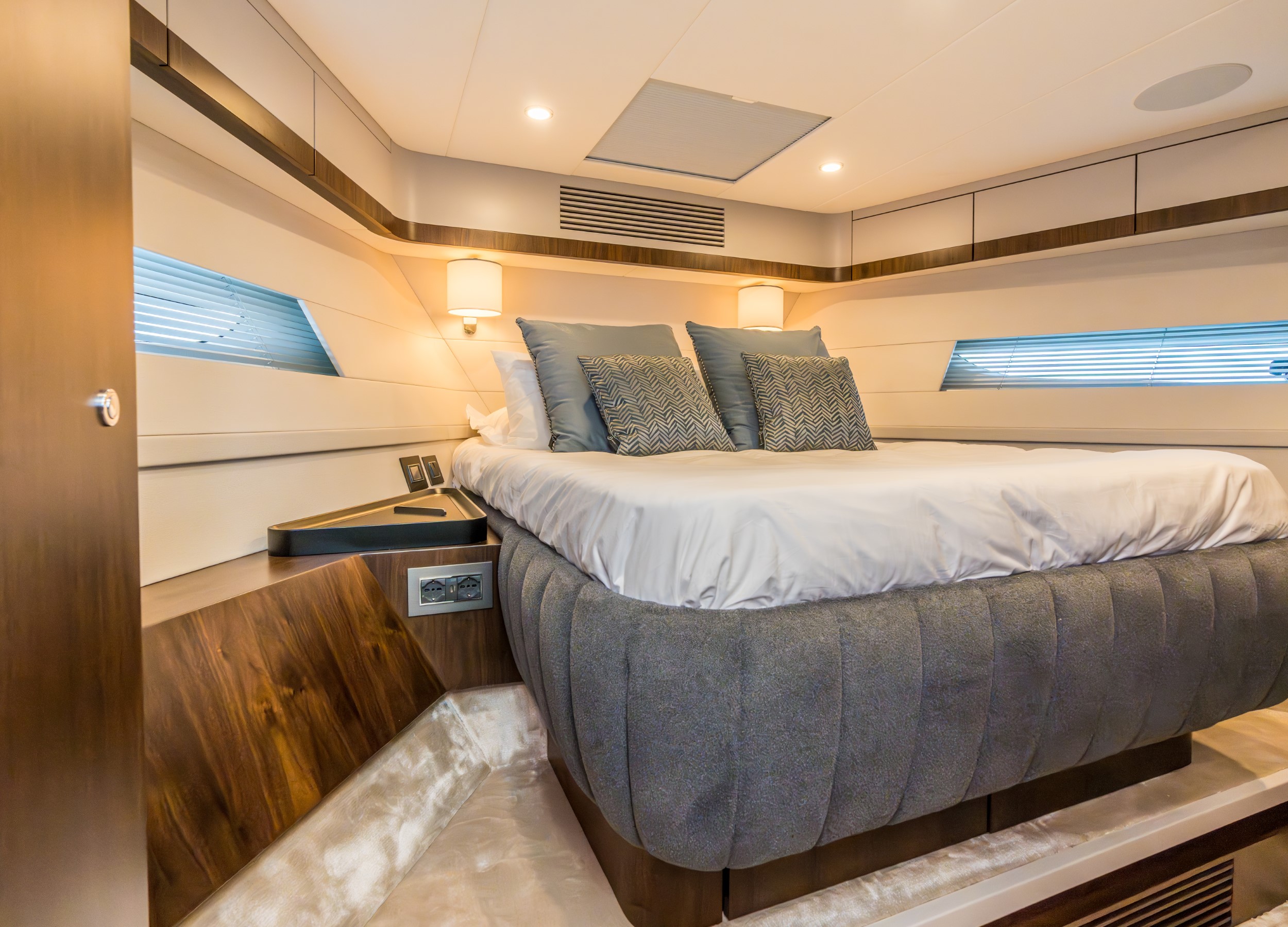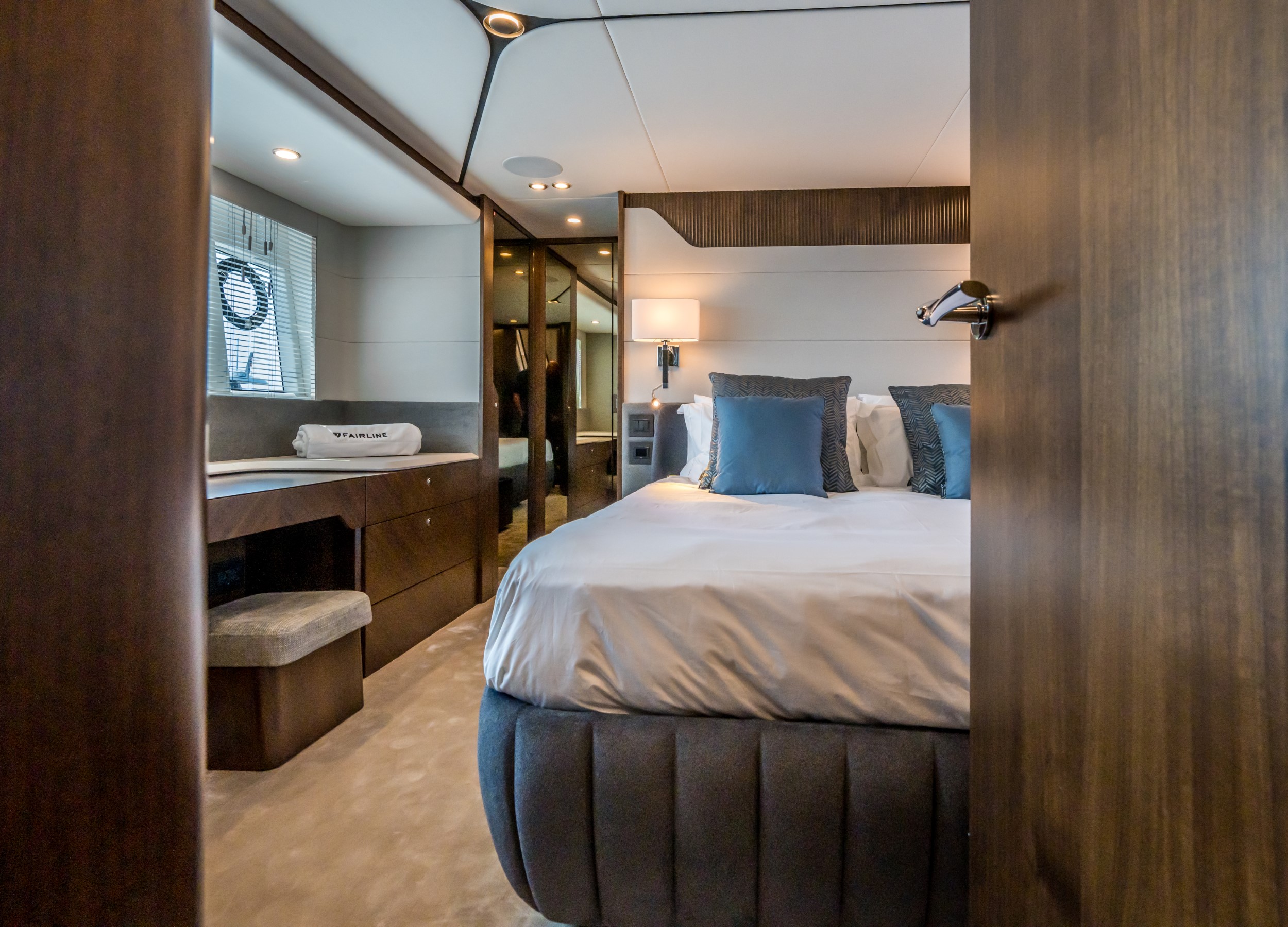• Our master cabin features a forward-facing bed, mini-sofa, vanity desk, generous hull windows and a large ensuite