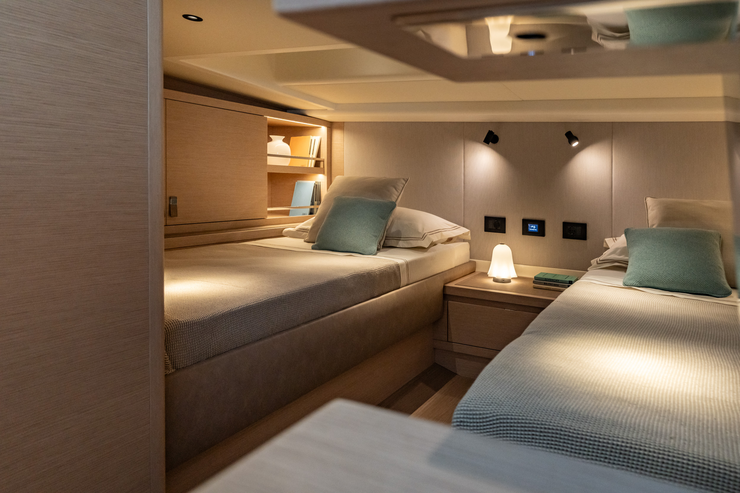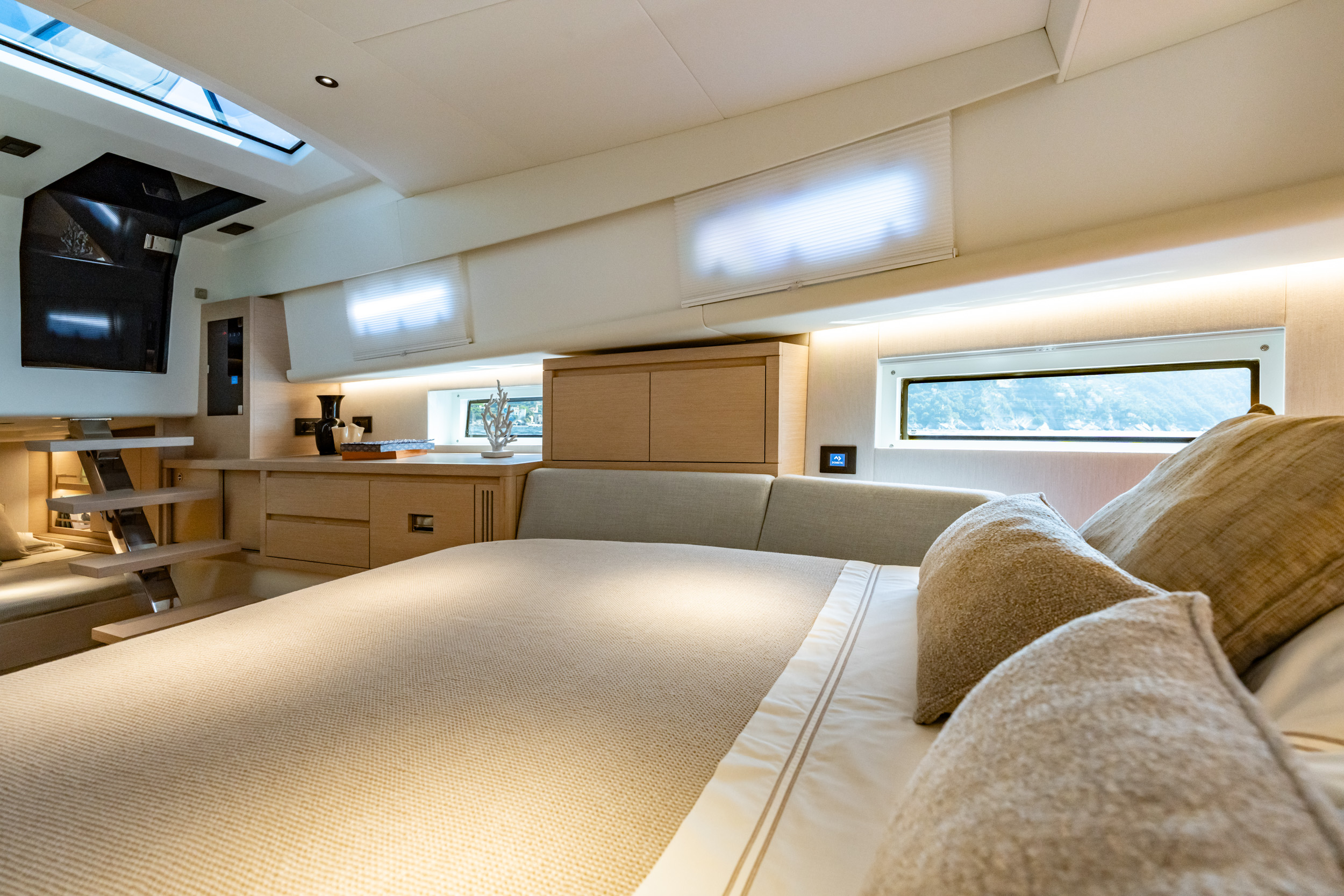 Inside, the new Pardo 43 offers a choice of two layout options to suit different needs and preferences: with a twin cabin aft and a fixed V-berth ensuite in the bow, or a forward dinette with bench seating that can be easily transformed into a comfortable double bed. The interior has been refined with more fabric ceiling panels, reducing visible structural elements for a cleaner, more stylish look. Window shades have been upgraded for improved light control and privacy, and the air conditioning system now extends to the bathroom, ensuring maximum comfort throughout the yacht. The aft twin cabin has been made more spacious, with an additional 80 mm of headroom, making them feel even more open and airy. A 32” TV offers enhanced entertainment options for those relaxing below deck. New wood finishes and ambient lighting elevate the atmosphere onboard, while integrated storage niches keep every space functional and tidy.