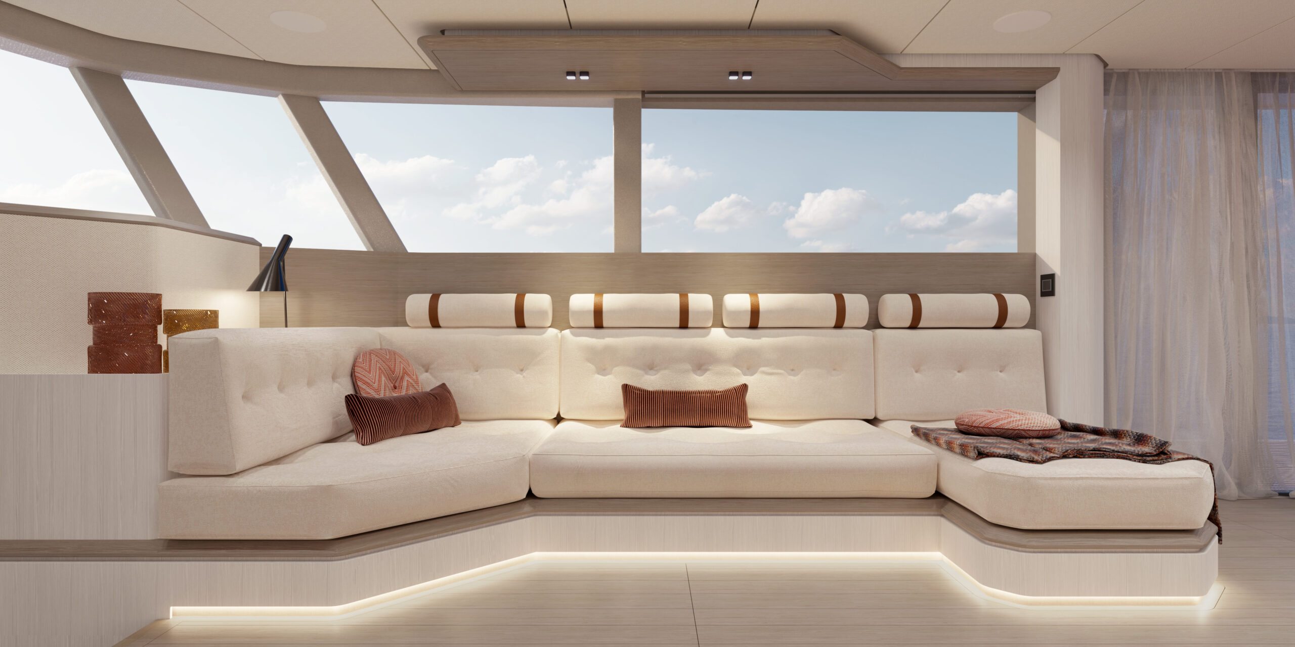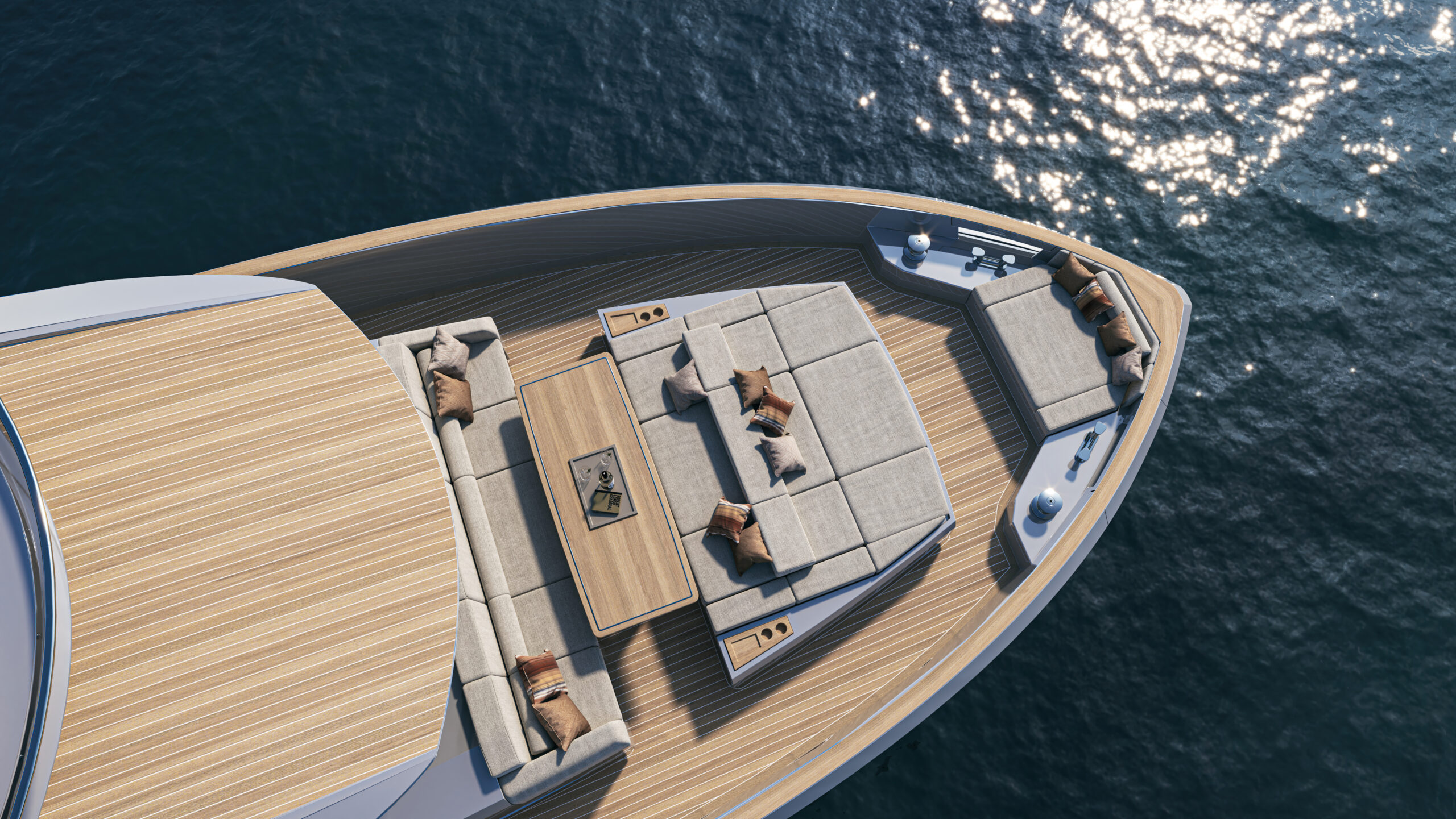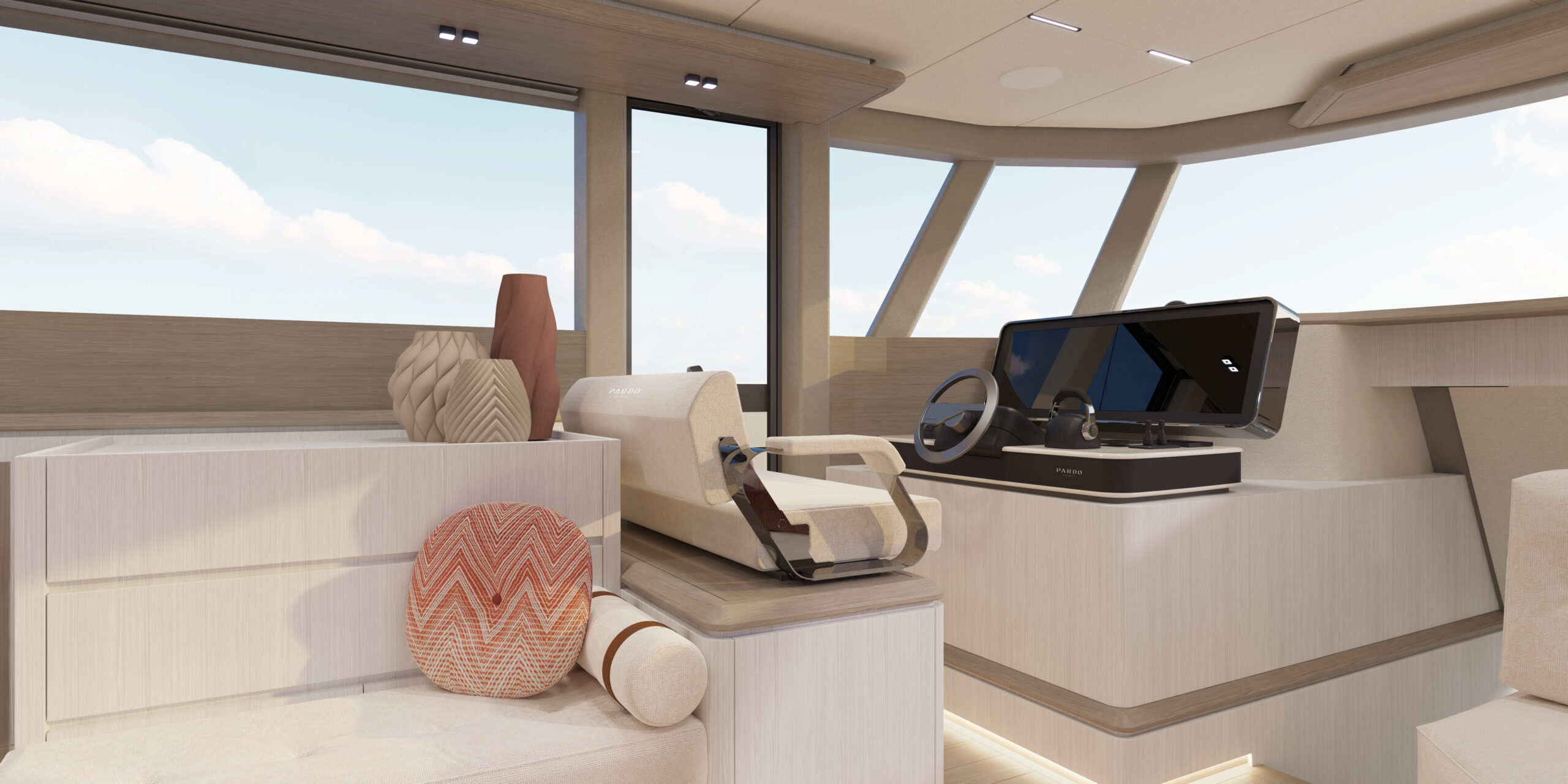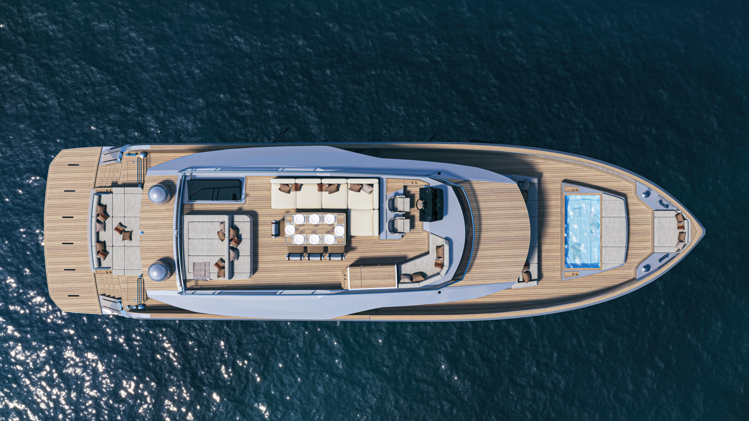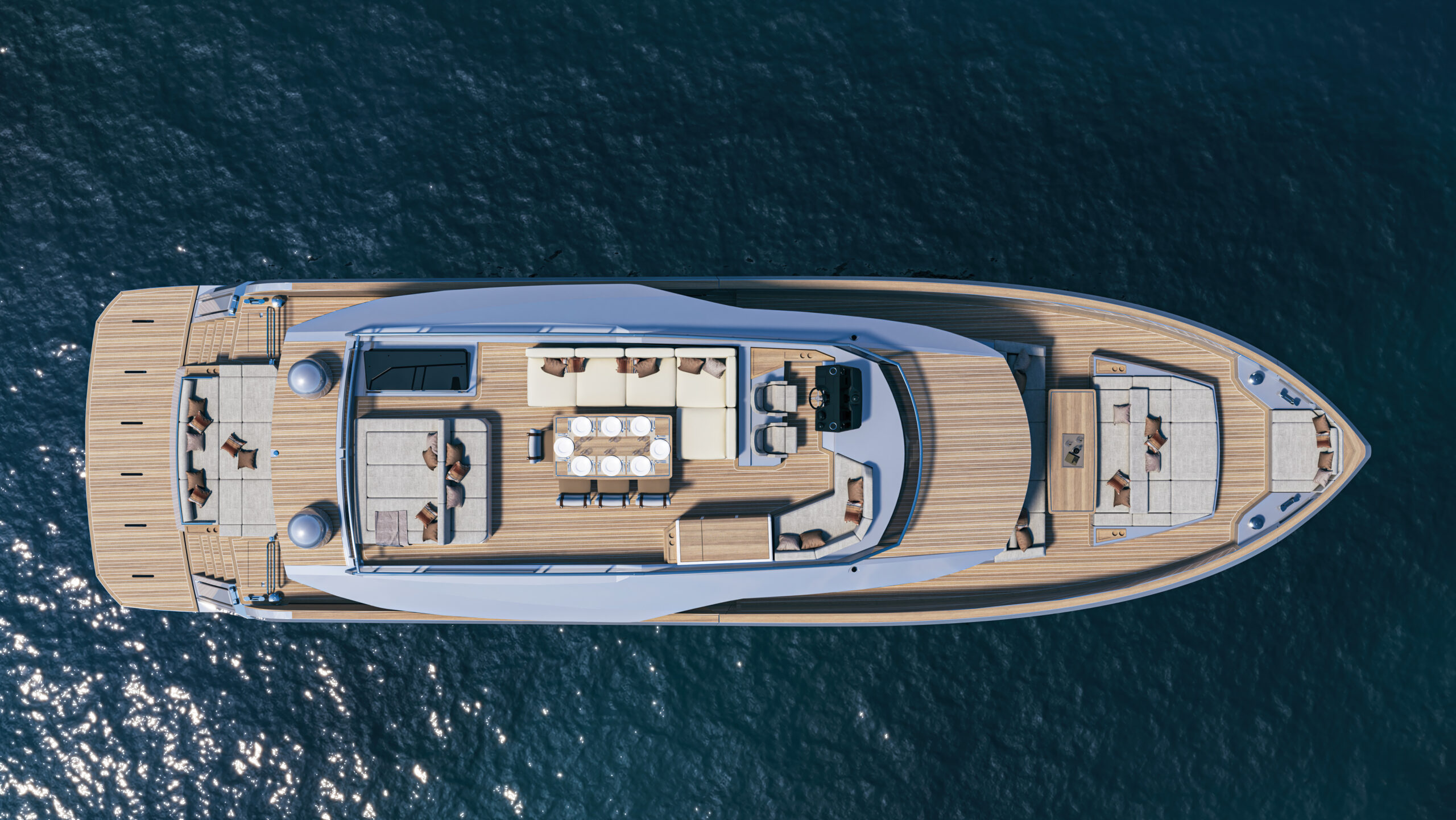 Design, style and livability – both inside and out – are at the heart of the project. The Pardo family feeling is evident in the distinctive bow lines as well as in the walkaround deck and aft area. The cockpit area, equipped with two fold-down side terraces to create a huge chill-out zone overlooking the water, offers over 40 sqm of living space with a submersible swim platform. A manual or automated haulage system for tender operations allows to store a tender of up to 4m in the aft garage.