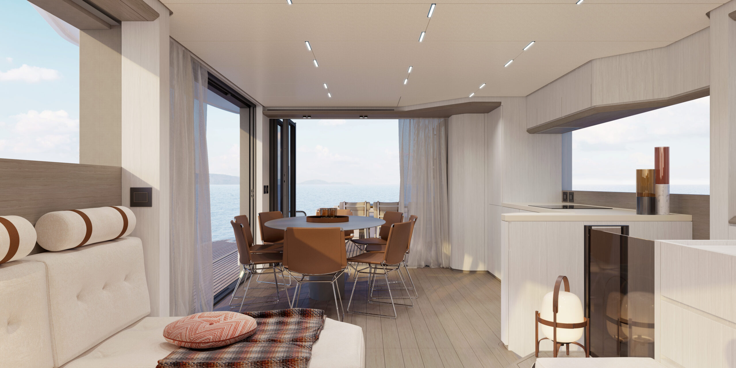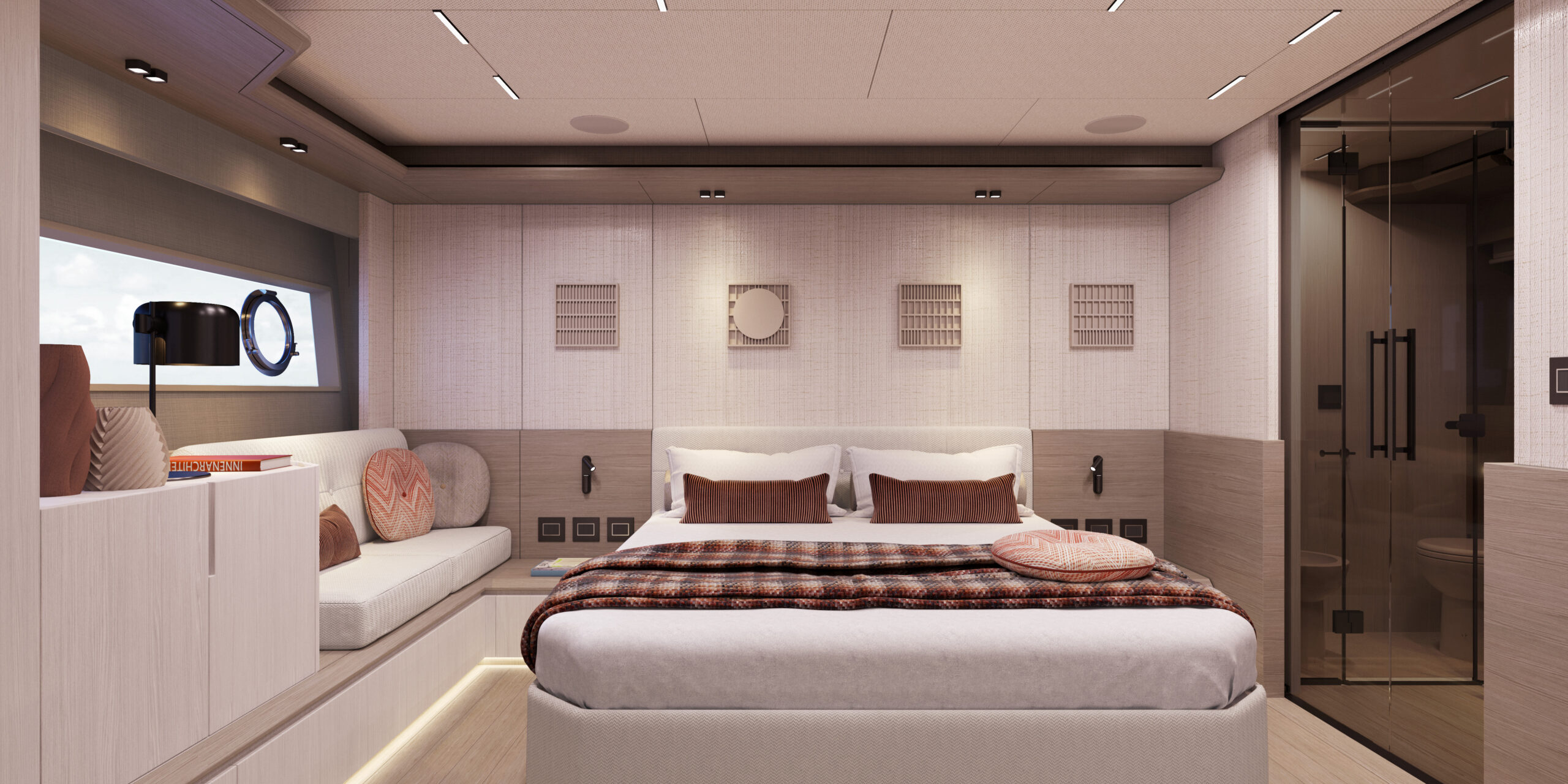 For the interior design of Endurance 72, Pardo Yachts has relied on the extensive knowledge and skills of BURDISSOCAPPONI Yachts&Design, hence sealing a new collaboration. Elegant gray walnut veneers with a matt finish, wallpapered bulkheads on the lower deck, technical fabrics for the ceilings, white Corian for the galley worktops and sand-colored resin in the bathrooms are some of the stylistic choices of the new designers.