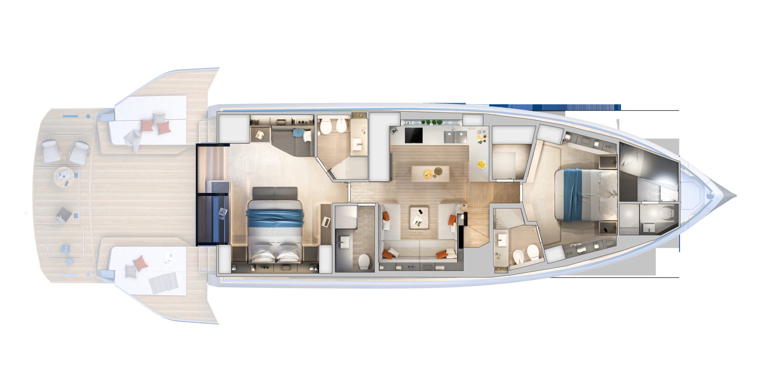 The accommodation space varies according to the owner’s needs: the layout of the lower deck is in fact designed to accommodate two, three or four cabins, for a total of 10 berths.