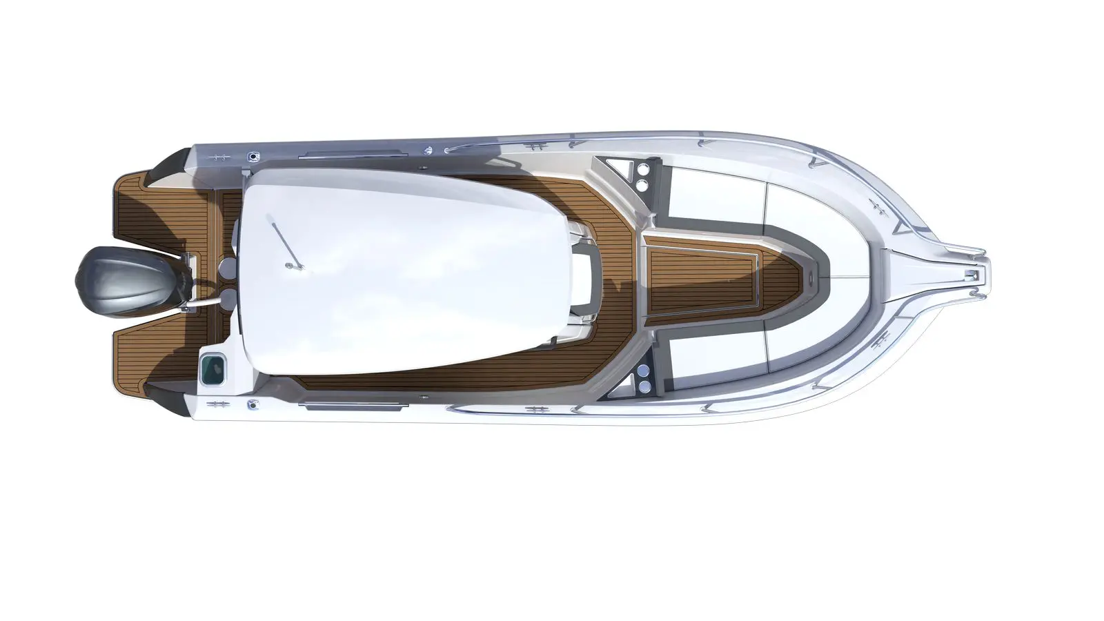 The integrated aft swim platforms offer easy access to the sea, while the integrated livewell will meet the needs of anglers. The aft saloon has a retractable bench seat to allow the circulation of fishermen, divers and skiers.