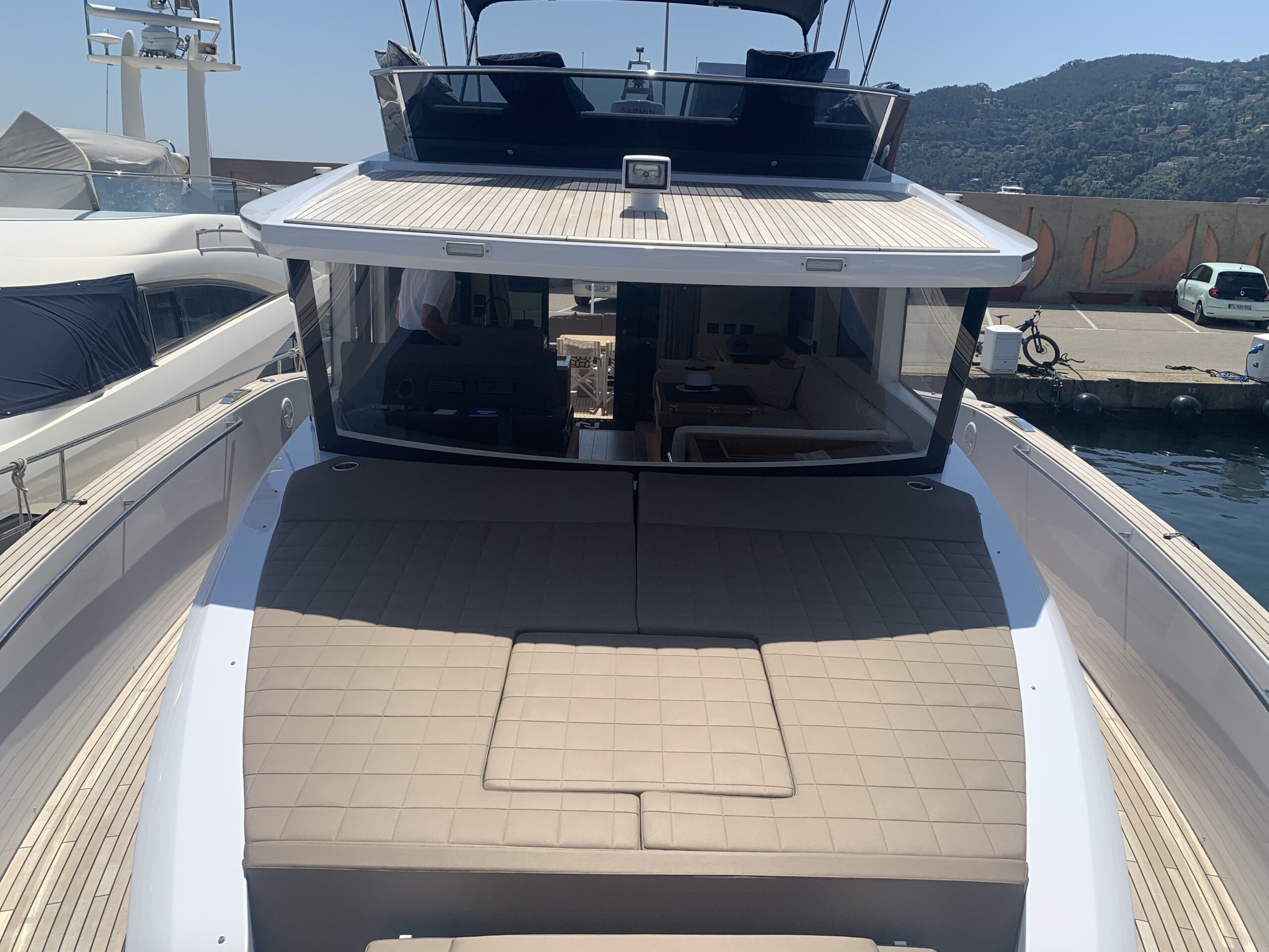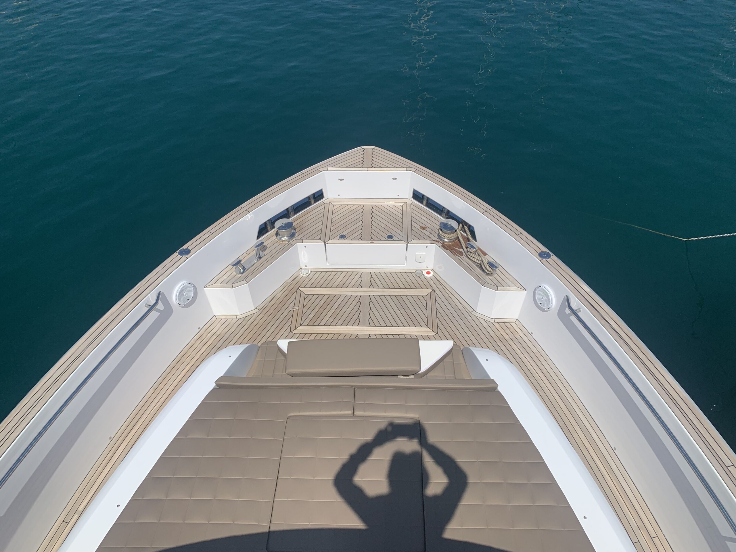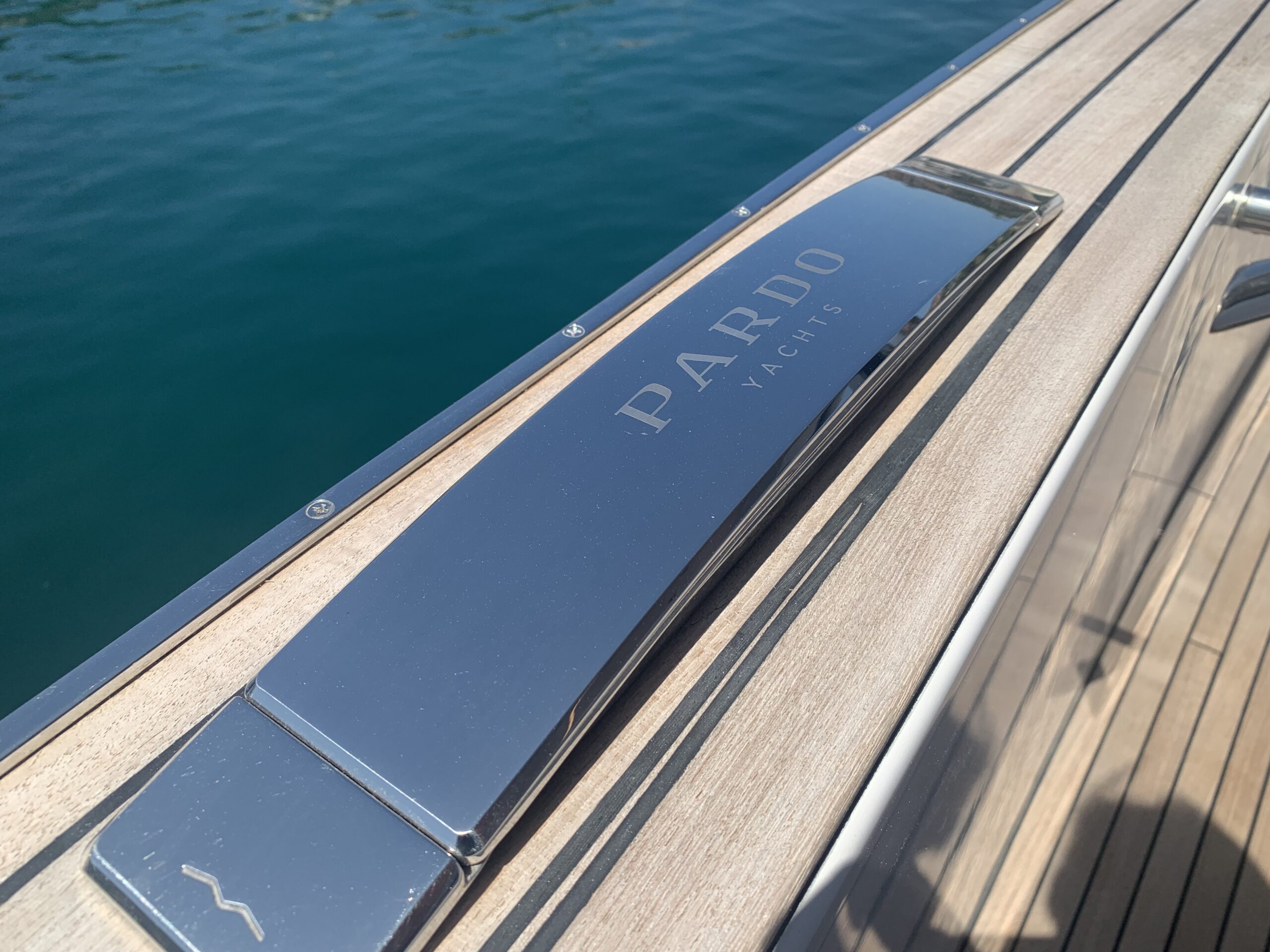 Natural teak deck and stern platform with black caulking