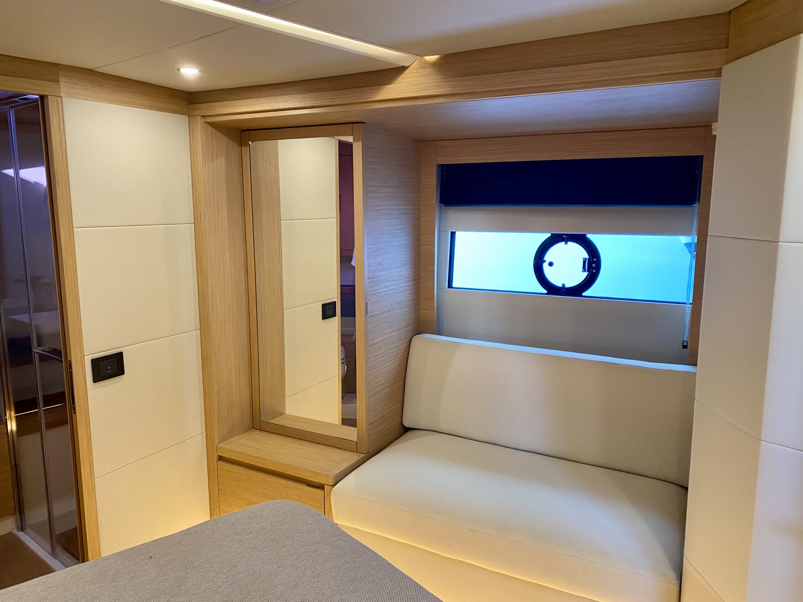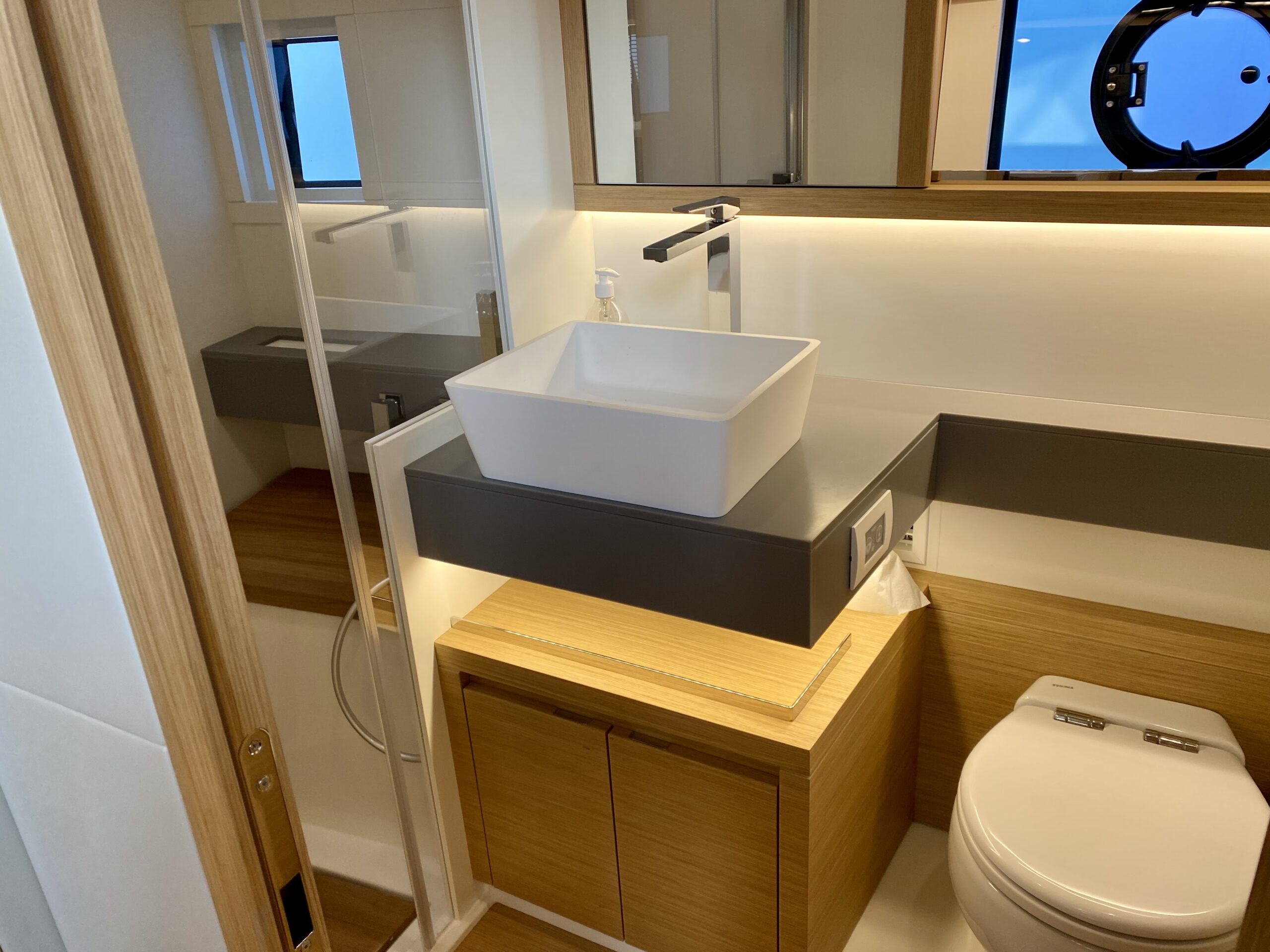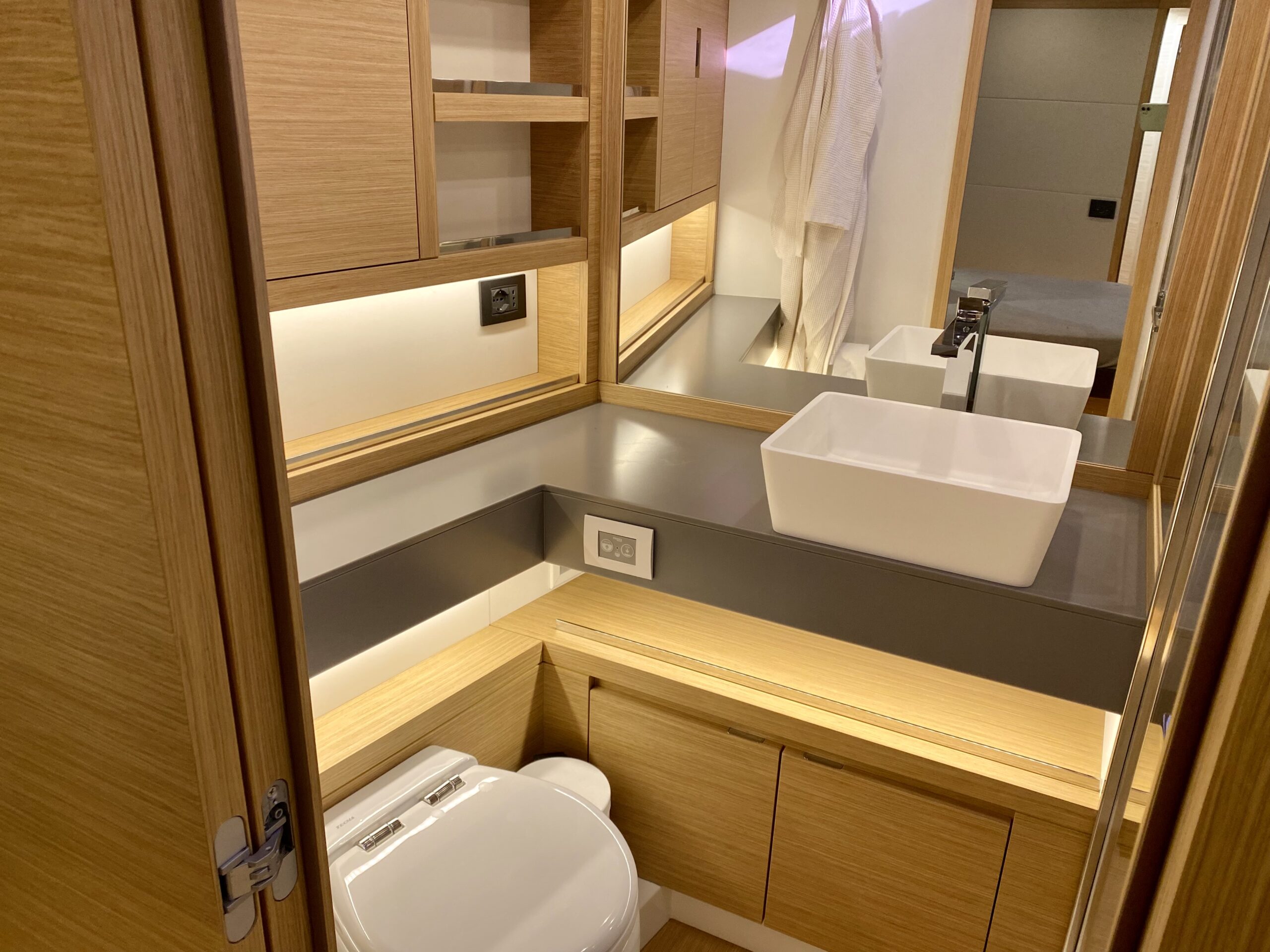 Premium Designer interior finishes (teak gratings and shower seats, gray technical marble vanity tops, teak toilet floors, leather coverings on the walls).