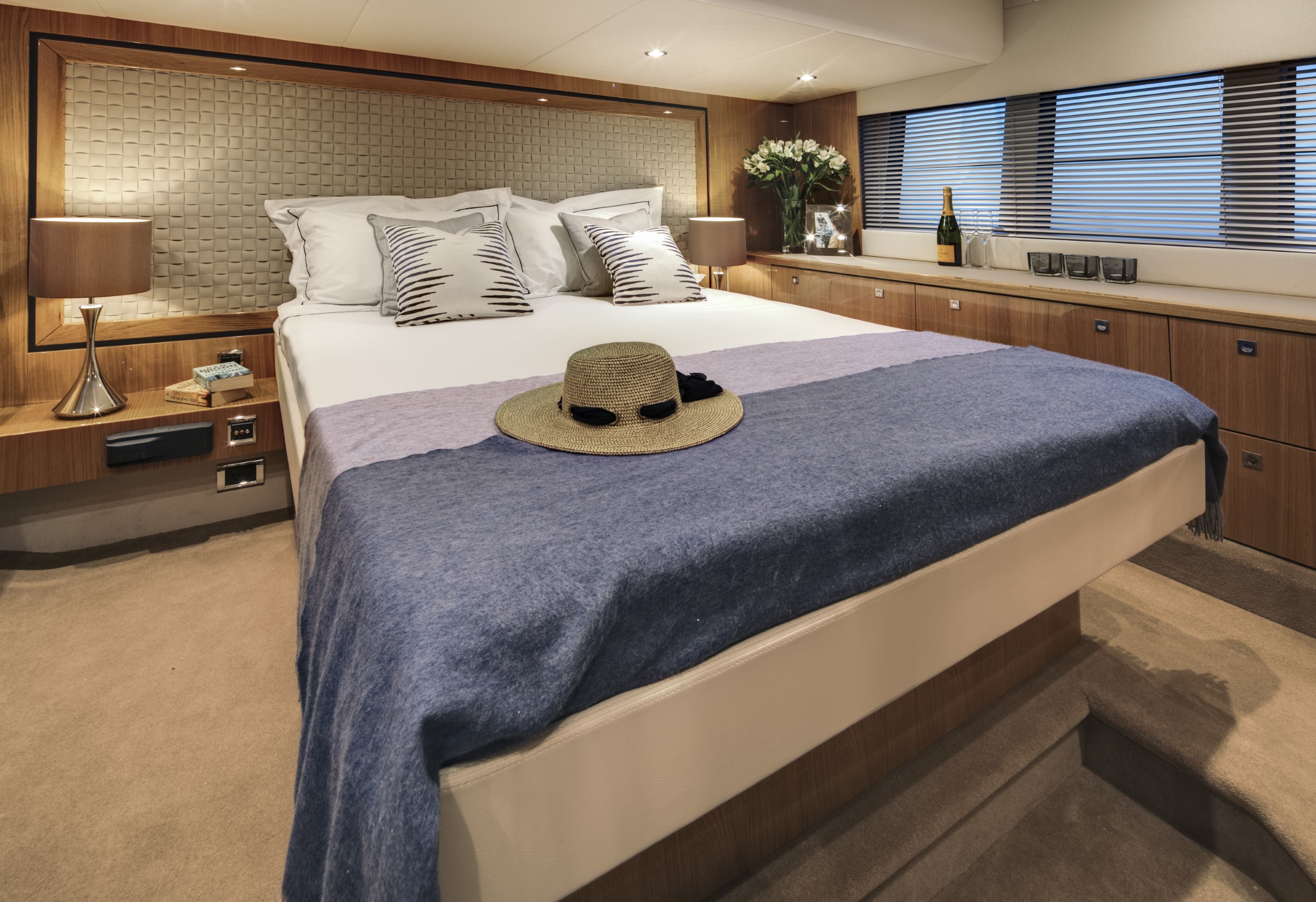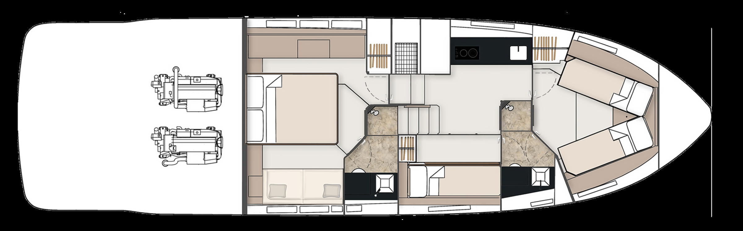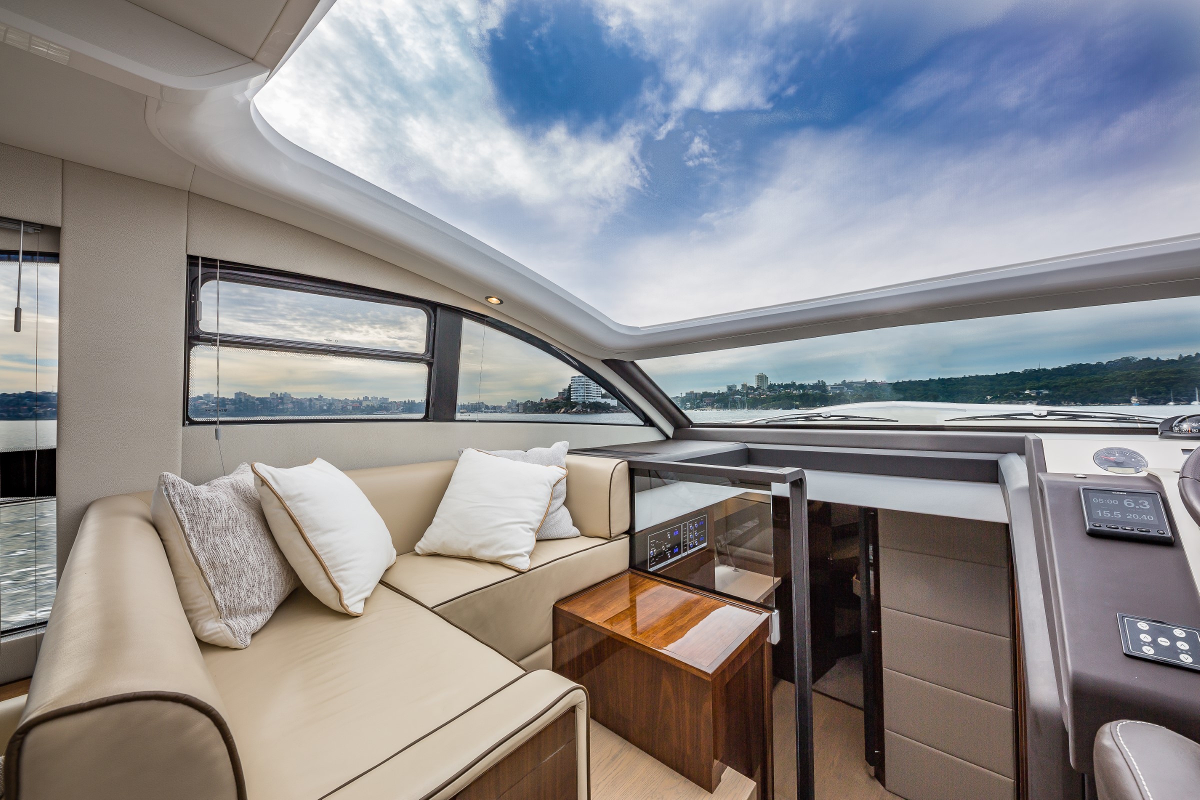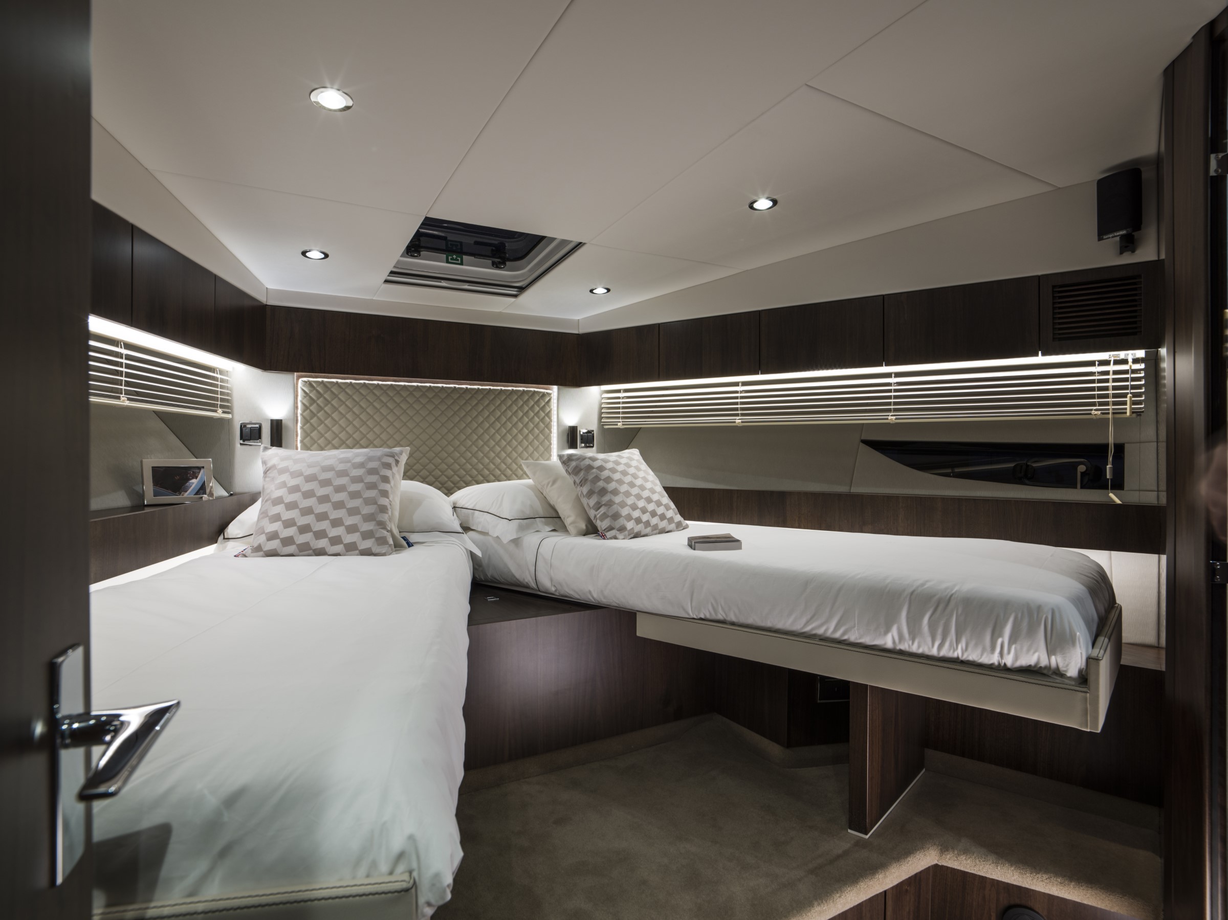 Les lignes épurées et puissantes du Targa 50 GT laissent place à une cabine luxueuse et spacieuse, dotée d'un ensemble de caractéristiques étonnantes et luxueuses, telles que des planchers en chêne, des plans de travail et des incrustations en blanc de Carrare et des moquettes torsadées en laine 100 % néo-zélandaise, qui ne manqueront pas de captiver le cœur et l'esprit de tous ceux qui monteront à bord. Et lorsqu'il s'agit de faire monter le rythme cardiaque, les deux moteurs Volvo IPS 650 ou 700 qui propulsent le Targa 50 GT vous laisseront sans voix. POINTS FORTS DE LA SPECIFICATION - Deux cabines / deux salles de bain - Choix de la cabine principale centrale ou avant - Pare-brise d'une seule pièce pour une vue imprenable - Grands bains de soleil luxueux à l'avant et à l'arrière - Garage entièrement intégré pour le Williams 285 TurboJet POINTS FORTS DE L'EQUIPEMENT EN OPTION - Propulseur d'étrave - 3 cabines - Stabilisateur gyroscopique Seakeeper 6 - Elégant éclairage d'ambiance extérieur bleu ou blanc - Système de positionnement dynamique Volvo - Restez au frais grâce à la climatisation haute capacité - Puissant système audio Sonos intégré