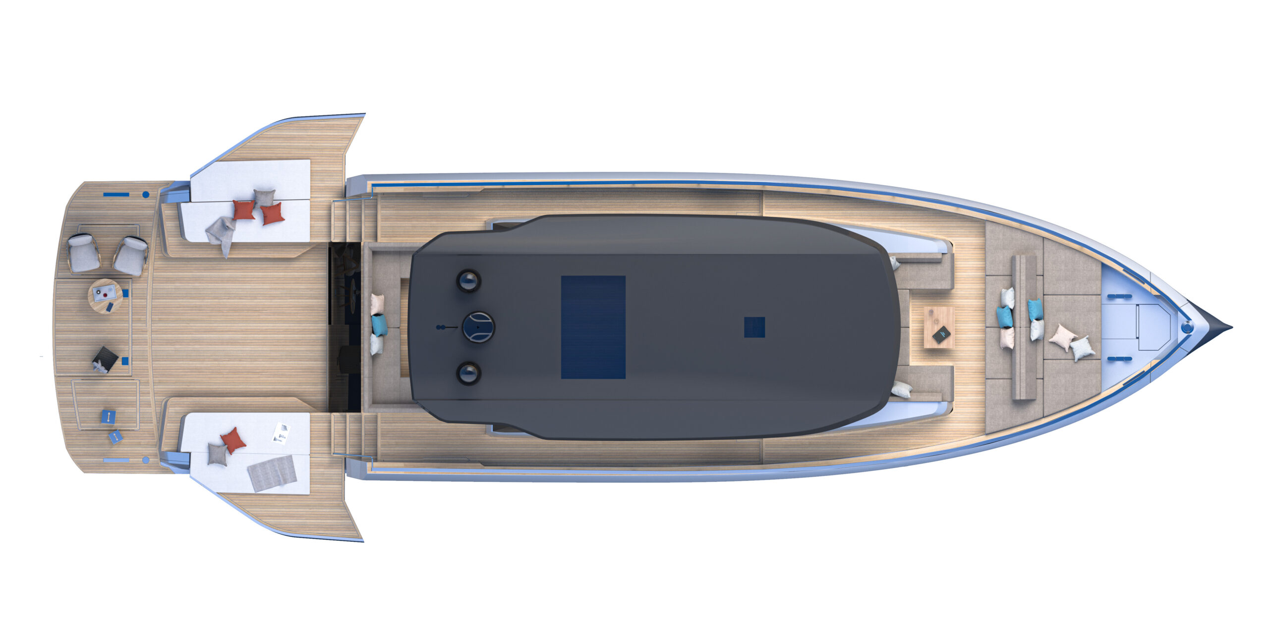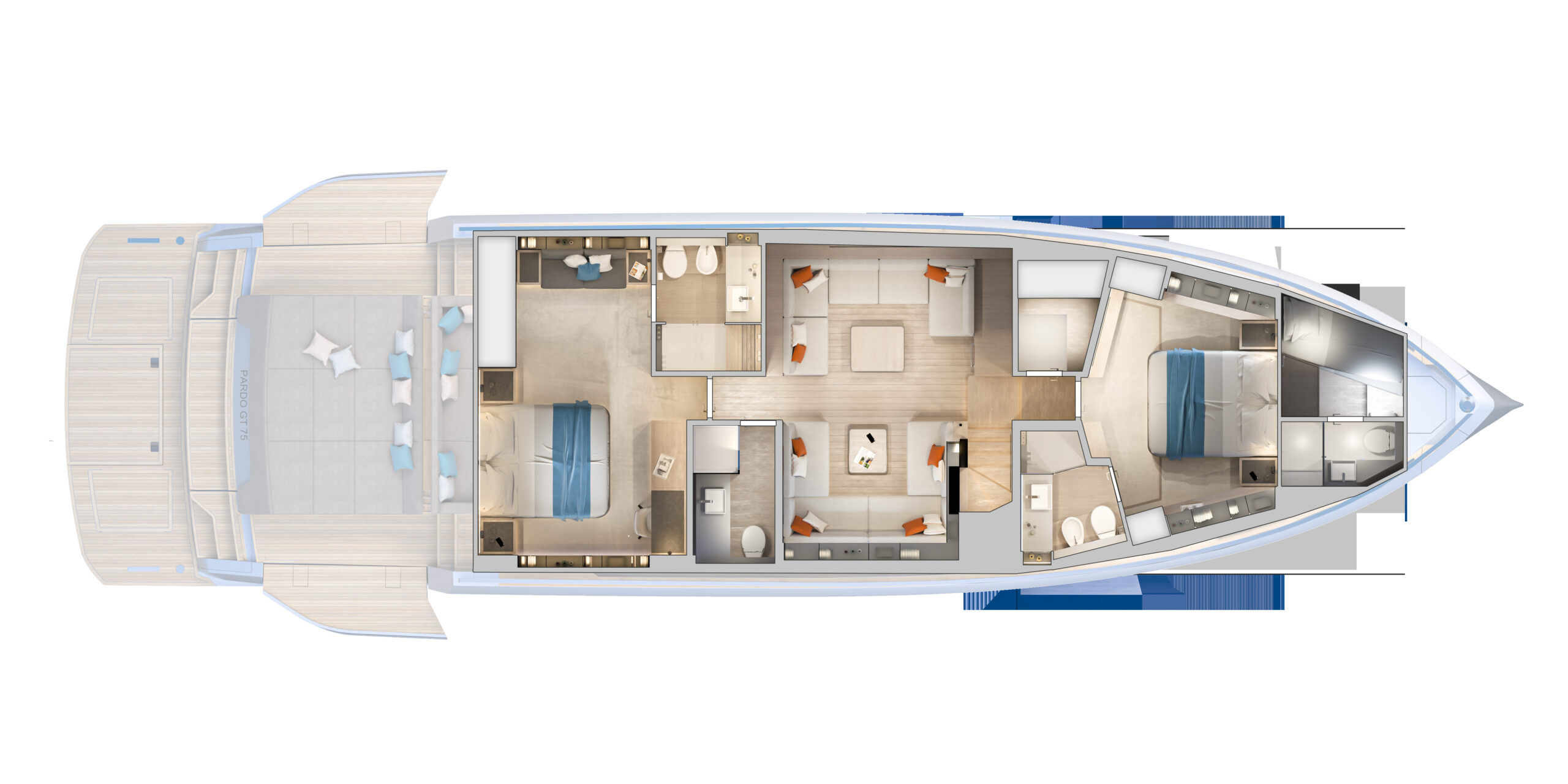 PARDO GT 75 : Le nouveau navire amiral de la flotte Pardo Yachts se positionne entre les gammes Walkaround et Endurance, où l'accent mis sur des volumes intérieurs extrêmement confortables va de pair avec les lignes de carène typiques d'un 75 pieds performant. Le caractère luxueux et élégant de l'intérieur sera le cadre idéal pour le propriétaire qui souhaite vivre le bateau comme une villa sur la mer : des espaces et des volumes parfaitement pensés pour optimiser chaque recoin du bateau, de la zone de vie aux espaces d'habitation. Pour les extérieurs, le PARDO GT 75 propose de grands bains de soleil et les espaces lounge sur la plage arrière et avant seront les terrasses parfaites pour profiter d'un contact privilégié avec la mer.